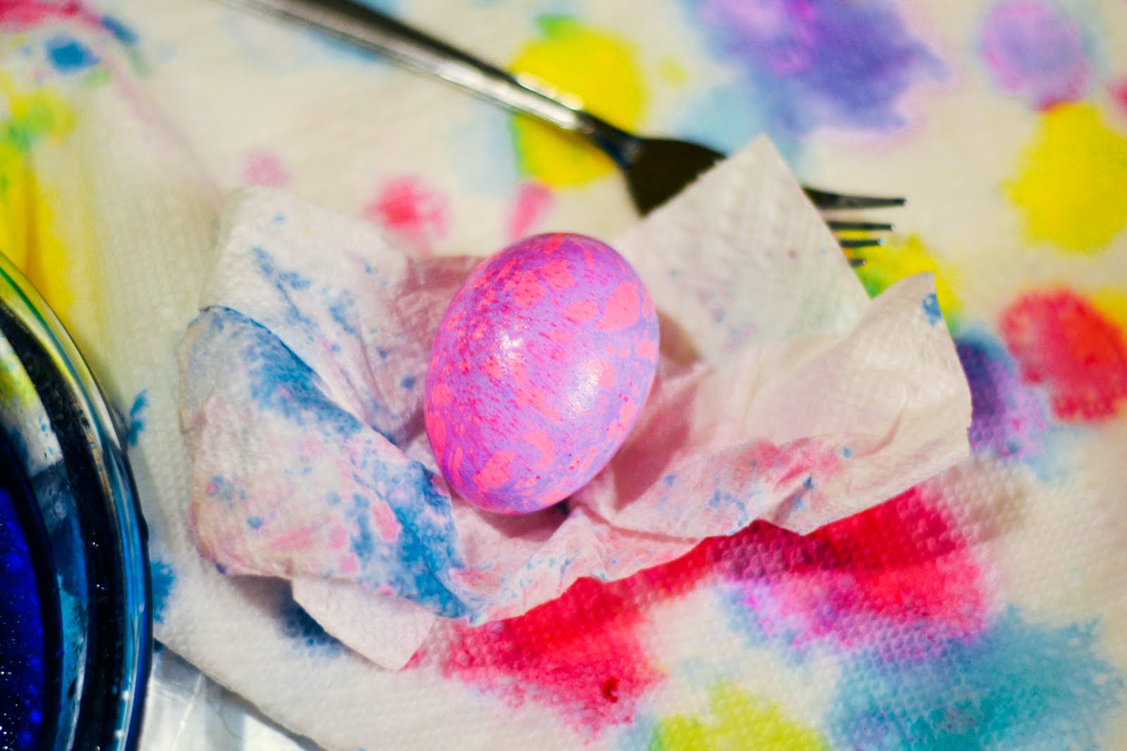 6) Then, use a fork to stir up the water and oil mixture in a shallow dish. Roll your egg around in this mixture, and you'll see oil streaks appear on your egg! Remove the egg and carefully wipe down with a paper towel. Let the egg continue drying, and repeat with the rest of the eggs!